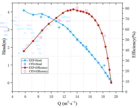 Figure 7 shows the comparison of CFD predicted energy performance with experimental results. As shown in the figure, when the flow rate is 14 m3/s, the CFD predicted head is 2.41 m, with a prediction efficiency of 80.54%. The experimental measured head is 2.46 m, with an efficiency of 77.83%. The relative deviation of the head is 3.3%, and the relative deviation of efficiency is 1.9%. Simultaneously, through a comparative analysis of numerical simulation outcomes and experimental results across four additional flow conditions, the observed errors consistently fall within a 5% margin. The comparison results show that the CFD prediction results are in good agreement with the experimental results.