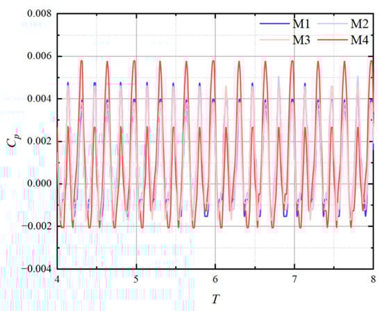 Employing eight times the impeller rotation period as the sampling interval, an analysis of pressure pulsations within the axial flow pump flow field was conducted. To scrutinize the pressure pulsations, a pressure pulsation coefficient, denoted as Cp, was introduced, and its analytical expression is as follows: