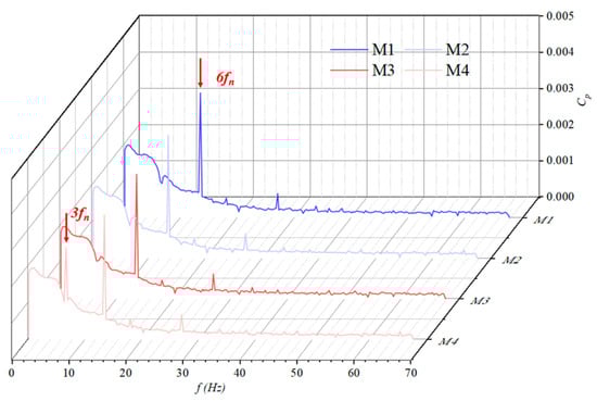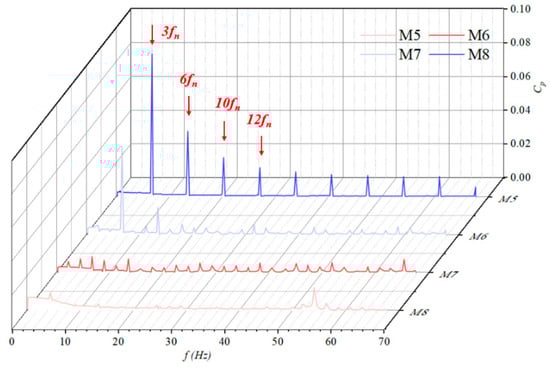 Figure 13 is frequency-domain data of pressure fluctuations at the impeller inlet stage. As can be seen from the figure, the elementary frequency at each point is three times the rotational frequency (blade passing frequency), which once again proves that the pressure of the water body is affected by the blade rotation when it is not passing through the blade. Furthermore, it is evident that monitoring points M5 and M6 distinctly manifest heightened amplitude values, particularly at positions corresponding to 6 and 10 times the rotational frequency. This is mainly because the monitoring point is located close to the wheel flange, and the water at this location is relatively complex. The water at this location is easily affected by secondary flow from the impeller position and the boundary layer, so the distribution of its frequency-domain amplitude is also relatively complex. Upon scrutinizing the frequency-domain curves for each monitoring point, it is discerned that the vibration amplitude of pressure pulsation exhibits a diminishing trend from the rim to the hub. This trend suggests that the water at the rim position of the impeller inlet stage experiences a comparatively greater influence from the presence of the blades.
