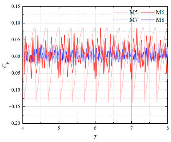 Figure 12 presents time-domain data depicting pressure pulsations at the impeller inlet stage. It can be seen that the pressure pulsation amplitude in the cross-section is clearly larger than the pressure pulsation amplitude in the inlet passage region. The pressure pulsation vibration curves at measurement points M6, M7, and M8 exhibit a notable complexity and lack distinct regular patterns. The pressure pulsation curve of the M5 monitoring point is relatively regular, with three peaks and valleys in each period. This proves that the water flow pressure at the impeller inlet stage is affected by the blades. Moreover, when comparing the amplitudes of the four monitoring points, there is a tendency to decrease from the rim to the hub, indicating that the influence of the impeller on the imported cross-sectional water pressure is positively correlated with the cross-sectional radius.