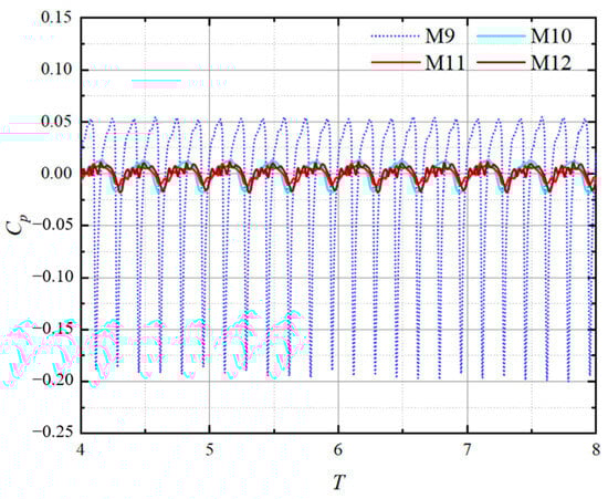 Figure 14 depicts time-domain data illustrating pressure pulsations at the outlet section of the impeller. The depicted figure reveals conspicuous regularity in the time-domain curves of pressure fluctuations at each monitoring point. Within this context, the vibration curves for points M10, M11, and M12 exhibit a recurring pattern characterized by three peaks and three valleys in each cycle. This is the characteristic of water bodies caused by the rotation of impeller blades. The vibration curve observed at monitoring point M9 manifests six peaks and valleys in each cycle. This behavior can be attributed to the location of the monitoring point at the periphery of the impeller outlet section, rendering it susceptible to dynamic and static interference arising from the interaction between the impeller and guide vanes.