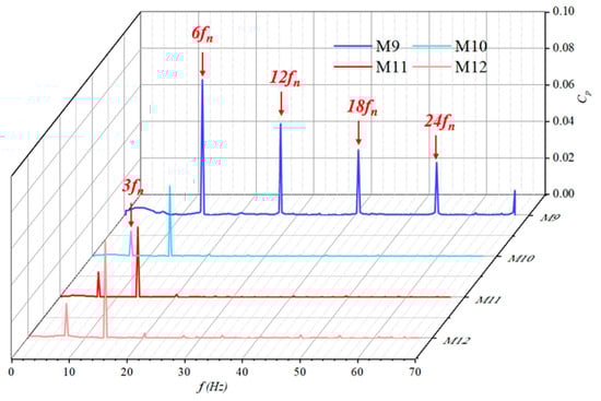 Figure 15 shows the frequency-domain diagram of pressure pulsation at the outlet section of the impeller. The figure reveals that the predominant frequency at each monitoring point corresponds to six times the rotational frequency, denoting the guide vane passing frequency. This observation underscores the substantial influence of the guide vane on the pressure pulsation frequency at this particular section. Furthermore, through a comparative assessment of the amplitudes at different monitoring points, it is apparent that the frequency-domain amplitude of pressure pulsation exhibits a diminishing trend from the wheel flange to the wheel hub. Among them, the amplitude of monitoring point M9 is the largest, with its main frequency amplitude being 2.74 times that of the M10 point. In addition, the frequency-domain curve of monitoring point M9 shows a significant high amplitude distribution at the positions where the guide vanes pass through frequency multiples such as 12 times the rotational frequency and 24 times the rotational frequency. Nevertheless, the impact of the impeller on monitoring points M10, M11, and M12 is notably more pronounced due to their proximity to the wheel hub. This proximity leads to a distinctive high-amplitude distribution at three times the rotational frequency, corresponding to the impeller passing frequency.