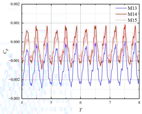 Figure 16 shows the time-domain diagram of pressure pulsation at the outlet section of the guide vane. This graph indicates that the vibration curves of each monitoring point in this section have a relatively consistent pattern, with three peaks and valleys appearing within a cycle. Moreover, the amplitude of the pressure pulsation curve at this position relative to the impeller outlet section has significantly decreased, with a decrease of over 92%, indicating that the guide vane has a significant adjustment effect on water bodies. Additionally, the graphical representation indicates that the pressure data on the curve for monitoring point M13 is comparatively subdued. In accordance with the Bernoulli formula, this can be attributed to the relatively rapid flow velocity at this location, ensuring adherence to energy conservation principles and consequently resulting in a lower pressure at this specific point.