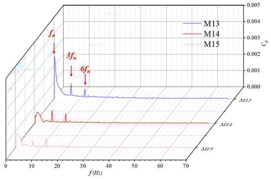 Figure 17 shows the frequency-domain diagram of pressure fluctuation at the outlet position of the guide vane. This figure indicates that the frequency amplitude of each point is relatively low, with a maximum amplitude of only 0.0028, which is significantly smaller than the impeller outlet section. At every monitoring point, there is a conspicuous high-amplitude distribution occurring at positions corresponding to 3 and 6 times the rotational frequency. This observation implies that these locations are subject to concurrent influences from both the blades and guide vanes. The primary frequency at monitoring point M13 corresponds to 1 time the rotational frequency, while monitoring point M14 exhibits a frequency of 3 times the rotational frequency, and monitoring point M15 reflects a frequency of 6 times the rotational frequency. This observation suggests that the impact of the guide vane blades becomes increasingly pronounced in closer proximity to the hub. Moreover, each cross-sectional point manifests a marked high-value distribution at a frequency corresponding to 1 time the rotational frequency. This observation signifies that the water pressure at these locations is influenced by the rotation of the axis of rotation.