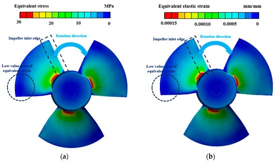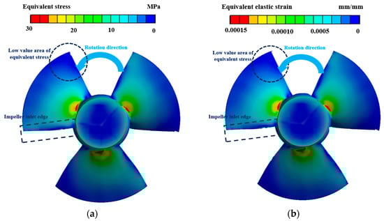 Equivalent stress–strain distribution on the pressure surface of the impeller. (a) Equivalent stress distribution, (b) Equivariant strain distribution.