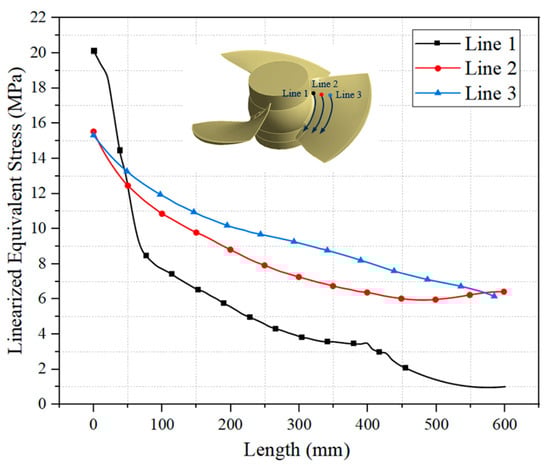 In summary, it is discerned that the distribution of equivalent stress at the impeller root becomes notably pronounced during the water flow pressurization process. Figure 20 depicts the variation in circumferential stress at the impeller root. Combining Figure 18 and Figure 19, we can observe that the distribution of stress at the impeller root is not uniform and that the stress at the outlet edge of the impeller blade is greater than the stress at the inlet edge of the impeller blade. Specifically, at the Line 1 position, this phenomenon becomes more pronounced near the root of the impeller. The stress at the impeller root near the impeller outlet edge is 20.2 MPa, while the stress at the impeller root near the impeller inlet edge is 1.01 MPa. Simultaneously, with an increasing radial distance, the non-uniformity in the circumferential distribution of stress within the impeller gradually diminishes. Observationally, at positions Line 2 and Line 3, a notable decrease in stress is evident near the impeller outlet, contrasted by a substantial increase in equivalent stress near the impeller inlet. The stresses at the inlet and outlet of the Line 2 and Line 3 impellers are very similar. The impeller, as the main flow passage component for water pressure in the pump device, should experience uniform distribution of stress at the root of the impeller during operation. In this article, the concentration of high stress areas at the outlet of the impeller can indicate the occurrence of radial flow or detachment on the surface of the impeller blade, resulting in uneven flow of water on the blade surface. In the course of water operation, the blades experience non-uniform reaction forces, leading to an uneven distribution of stress and strain at the impeller root.