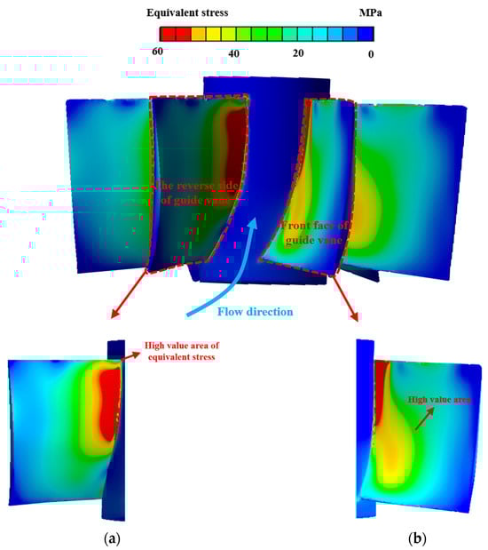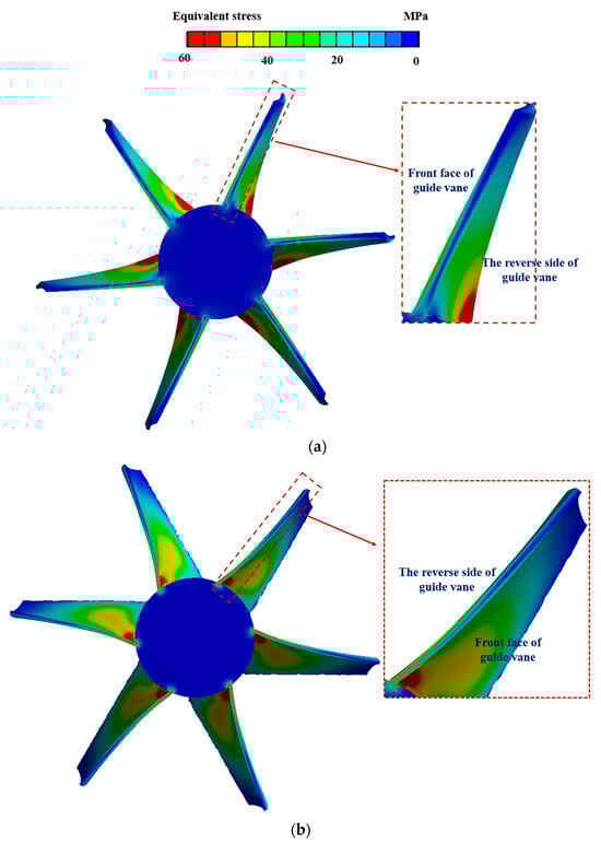Equivalent stress distribution on the guide vane section. (a) Equivalent stress on the reverse side of guide vane, (b) Equivalent stress of the front face of guide vane.