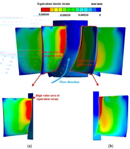 Distribution of equivalent strain on the guide vane section. (a) Equivalent strain on the reverse side of guide vane, (b) Equivalent stress of the front face of guide vane.