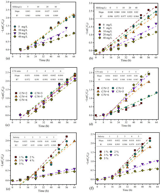 Removal kinetic models of SDZ (a,c,e) and TN (b,d,f) with different initial SDZ concentrations (a,b), different C/N ratios (c,d), and different salinities (e,f).