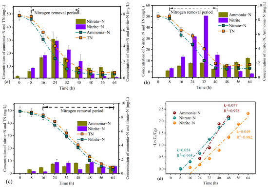 The changes in nitrogen concentration with different nitrogen resources (ammonia-N (a), nitrite-N (b), and nitrate-N (c) as sole nitrogen resource) and removal kinetic models of TN (d).