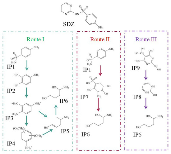 The intermediates of SDZ degradation were identified via QExactive LC-MS/MS and analyzed on the basis of biology and chemistry principles. A total of nine intermediates were identified, namely IP1, IP2, IP3, IP4, IP5, IP6, IP7, IP8, and IP9 with the mass charge ratios (m/z) of 174, 142, 128, 207, 99, 105, 222, 100, and 191, respectively. The proposed elemental composition and chemical structure of each intermediate are provided in the Supplementary Material (Table S2). The identified TPs can be divided into three categories: benzene ring compounds, sulfanilamide ring compounds, and single-chain compounds. Three possible transformation pathways were proposed based on the detected TPs and biological characteristics (Figure 5). In Route I, IP1 is formed due to the elimination of pyrimidine groups from SDZ. Then, IP1 loses a SO2 to form IP2, which is then further transformed to IP3 by losing a methyl group. IP3 can be hydroxylated at the location of -NH2 to form IP4. Alternatively, the aniline ring of IP3 can be broken to form IP5, and the amino group of IP5 is then hydroxylated to form IP6, which is the final product of SDZ degradation. Other researchers also reported that the C-S bond may be one of the priority reaction sites of sulfa antibiotics [48]; the first bond-breaking step usually occurs between NH2 and the pyridine ring, and SDZ-pyridine is obtained [49]. In Route II, the benzene ring of IP1 is hydroxylated to form IP7, and the ring of IP3 is further broken to form IP6. In Route III, IP9 is formed by the breaking of the bond between NH2 and a pyrimidine ring, the pyrimidine ring of IP9 is then broken to form IP8, and IP8 is hydroxylated at the location of -NH2 to form IP6. Therefore, it can be speculated that the main reaction sites for SDZ transformation include the N-C bond, N-S bond, pyrimidine ring, and benzene ring [49,50].