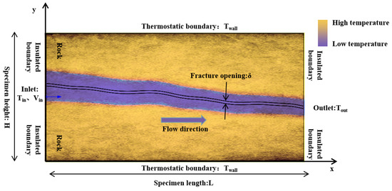 In this study, the finite element software FLUENT 2020 was used to solve the control equation, considering that the HDR had extremely low permeability and assuming that the rock mass was impervious and the fluid incompressible. Figure 1 is a schematic diagram of the seepage and heat transfer process of rough fractures, which conceptually represents the heat transfer process of fluid through rough fractures. The fluid flows and transfers heat at the initial velocity (m/s) and initial temperature (K) from the inlet along the fracture surface with an aperture of (m) and flows out from the outlet at temperature (K); the upper and lower walls are the thermostatic boundaries with a temperature of (K) and the left and right walls are insulated walls. The heat transfer process between multiphase fluids and rock mass follows continuity Equations (2) and (3) and N-S Equation (4).