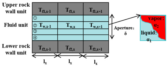 where is the aperture of the fracture (m), satisfying ; is the average specific heat capacity of the control body (J/kg·K) for the multiphase fluid, satisfying ; is the average density (m3/kg) for the multiphase fluid, satisfying ; and is the length of the fluid unit, satisfying ; , and are the temperature (K) of water, the upper and lower walls at position i, respectively.
