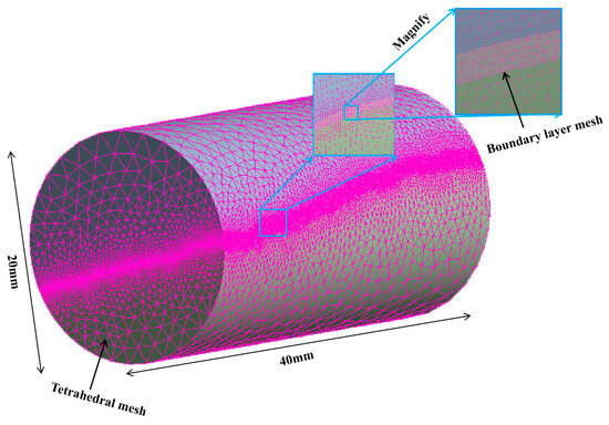 Through the Brazilian splitting test, cylindrical granite rock samples with a diameter of 50 mm and length of 100 mm were used to prepare fracture surfaces with roughness. The two split rock specimens were closed together, and a photograph of the end face was taken of them in their natural state. Then, based on the captured images, the ratio of the fracture aperture to the diameter of the rock sample was calculated. Finally, based on this ratio, the average aperture of the fracture was determined to be 0.4 mm. The geometric data of the fracture surface were obtained using a blue light 3D scanner with an accuracy of 0.01 mm. Subsequently, noise reduction and optimization processing were applied. To avoid the influence of edge damage caused by the splitting process on the fracture surface, as well as the widespread use of small-scale models in heat and transfer research [40,41], a local region of the fracture surface (15 ≤ x ≤ 35, 30 ≤ y ≤ 70) was divided using CAD modeling software SolidWorks 2020 (Figure 3). Next, a 3D rough fracture model with uniform apertures was constructed within this region. Finally, the geometric model was imported into Workbench Meshing for grid generation. During the meshing process, tetrahedral elements were employed to reduce discretization errors on the fracture surface. Additionally, boundary layer meshing was applied to simulate a no-slip boundary on the fracture surface, refer to Figure 4 for details. In order to obtain mesh-independent results for each specific geometric model, we determined the final number of grids of each specific geometric model by sensitivity analysis. The specific procedure involved controlling the maximum grid size in the fluid domain to obtain different numbers of grids. Subsequently, models with different numbers of grids were solved, and the temperature values at the outlet were monitored after convergence. The results for calculations with different numbers of grids are presented in Table 1. It can be observed that as the grid was further refined, the computational results eventually stabilized, but the computation time increased. Therefore, the maximum grid size at the contact wall and within the fluid domain was ultimately controlled to be no larger than 0.15 mm.
