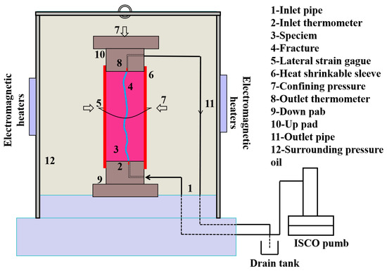 In a study of seepage and heat transfer under single-phase heat–flow coupling, Bai [37] conducted seepage heat transfer experiments using a multi-field triaxial experimental system (Figure 6) developed by the Institute of Rock and Soil Mechanics, Chinese Academy of Science, to derive the overall convective heat transfer coefficient. Therefore, this paper primarily relied on the experimental data obtained by Bai [37] to conduct simulation verification. In Bai’s [37] experiment, the surrounding pressure oil inside the chamber was first heated by an electromagnetic heater located outside the triaxial chamber. Then, the cylindrical granite rock sample measuring 50 × 100 mm was uniformly heated by surrounding pressure oil. When the temperature of the rock mass was consistent with the oil temperature, the pipeline was immersed at the sample inlet in high-temperature hot oil to ensure a stable fluid temperature at the inlet. Then, water was injected into the fracture at a constant flow rate by controlling the flow with an ISCO pump. Finally, temperature and pressure differences at the entrance and exit were obtained by setting sensors at the entrance and exit.