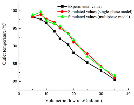 Figure 7 illustrates the disparities between the simulated results and the experimental outcomes. From the graph, it is evident that the simulated temperature values were higher than the measured values in the experiment. However, the maximum temperature difference between simulated and experimental values was 2.6 °C, with a relative error of 3.6%. The reasons for such discrepancies are diverse, including errors caused by the discrete process of fracture surface representation, fitting errors in the heat transfer parameters of rocks and fluids, and truncation errors during computer calculations. Referring to the simulation results from Tan [33], it can be observed that these errors fell within a reasonable range. Furthermore, from the graph, it can be observed that the outlet temperature values calculated by the two numerical models were very close. This indicates that in the absence of phase transition, the results of the multiphase flow–heat coupling model are also applicable for heat transfer research.