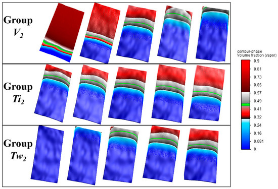Based on the established single-phase flow–heat coupling model, the fluid was added with the evaporation effect. This caused the phase transition phenomenon when the fluid temperature reached the saturation temperature. It led to a decrease in the liquid phase fluid percentage and an increase in the gas phase volume percentage within the unit. To study the influence of the phase transition process on the flow process, the V2, Ti2, and Tw2 group models considering the evaporative phenomenon and the V1, Ti1, and Tw1 group models without phase transition were compared. Figure 8 shows the distribution cloud map of the gas volume percentage in the fluid domain after the exit temperature stabilized. From the figure, it can be seen that there was a distinct gas–liquid interface between the gas and liquid phases. Near the inlet, the liquid phase dominated, while near the outlet, the gas phase dominated. Because the stable temperature of the Tw2–1 model did not reach the saturation temperature, only liquid phase fluid existed in the fluid domain.