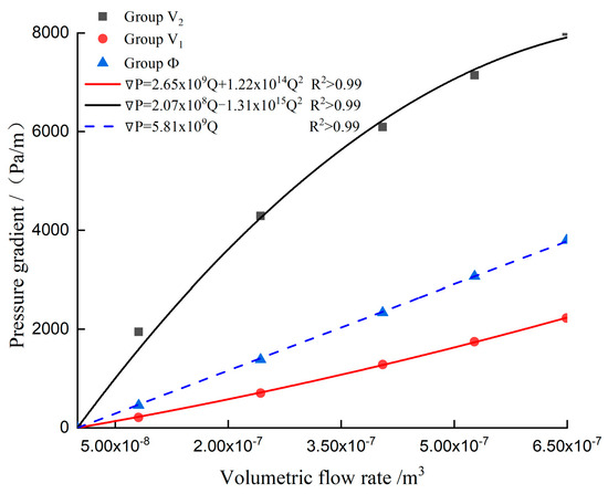 Figure 10 depicts the relationship curve between the pressure gradient and flow rate for the V1, V2, and Φ group models. In the Φ group of models, as the rock wall temperature was set to the same value as the fluid temperature, there was no heat exchange occurring in this system. From the dashed lines in the graph, it can also be observed that there was a linear relationship between flow rate and pressure gradient at this point. This indicates that without considering heat exchange, the movement of low-flow fluid in the fracture exhibited a well-defined linear relationship. This is consistent with the quantification expressed by Darcy’s law. However, when considering the heat exchange effects within the system, the relationship between pressure gradient and flow rate was no longer linear. This further illustrates that heat transfer effects alter the fluid’s motion state, making non-linear effects more prone to occur. This is because, in the absence of considering heat transfer effects, the nonlinear effects in the fluid often occur when the fluid has a relatively high velocity. This is also because excessively high velocities can render the inertia term in the Navier–Stokes equations non-negligible. On the contrary, when considering heat transfer effects, nonlinear flow behavior persists even at relatively low velocities. The main reason for this lies in the fact that temperature alters the physical parameters of the fluid, such as density and viscosity.