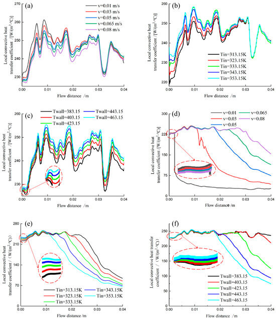 Distribution curve of local heat transfer coefficient along flow direction at different groups: (a) group V1; (b) group Ti1; (c) group Tw1; (d) group V2; (e) group Ti2; (f) group Tw2.