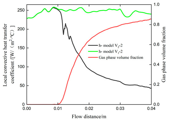 The local heat transfer coefficient and gas volume percentage of V1–2 and V2–2 change curves with flow direction.
