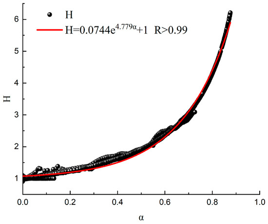 In order to further quantify the relationship between gas volume percentage and local convective heat transfer coefficients, a dimensionless number was defined to measure the extent of the influence on heat transfer when the fluid underwent phase transition Equation (15). From the equation, it can be observed that as increased, the impact of phase transition on heat transfer became more significant, but this influence was diminishing. Next, we compiled the values of at the midsection under all computed conditions and the corresponding gas volume percentage values at respective positions and then plotted them in Figure 13. From the figure, it can be observed that with the increase in gas volume percentage, the relative impact on the local convective heat transfer coefficient followed an exponential trend. When the gas volume percentage was 1, the local convective heat transfer coefficient without considering phase transition was approximately 10 times greater than when considering phase change effects. This further indicates that when considering phase transition effects, the gas volume percentage plays a dominant role in the distribution characteristics of the local convective heat transfer coefficient.
