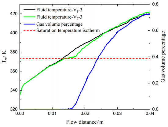 Figure 14 presents the distribution curves of fluid temperature and gas volume percentage, taking scenarios V1–3 and V2–3 as examples. From the graph, it can be seen that both had similar temperature distribution curves before the phase transition occurred. As the fluid temperature gradually reached the saturation temperature, neglecting the phase transition effect of the fluid resulted in a steady increase in fluid temperature. However, considering the phase transition effect caused the temperature of the fluid to gradually slow down after reaching the saturation temperature. The reason for this phenomenon is twofold: on the one hand, it is due to the low gas content within this range, and on the other hand, it is because the absorbed heat during the phase transition process is used to overcome intermolecular forces, thereby generating gaseous fluid. By comparing the distribution curves of gas volume percentage, it can be observed that as the phase transition began, the gas volume percentage gradually increased, and the temperature increase rate of the fluid also gradually intensified.