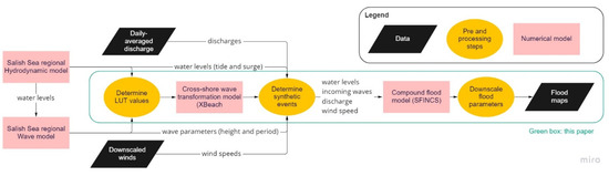 First, regional boundary conditions are based on (1) the hydrodynamic (tide–surge) model as developed by [19] and (2) the wave model for swell and wind waves developed by [20]. The regional hydrodynamic model is a Delft3D Flexible Mesh [24] model to compute tides and surges across the Salish Sea. The regional wave model is a combination of a linear transformation of Pacific Ocean swell and locally generated wind waves. Moreover, data on daily averaged discharges and downscaled winds are used as inputs to the entire workflow (details described below).