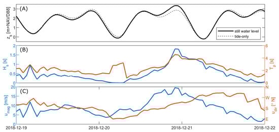 Modeled time series of still water level (panel (A); [19]), wave height (blue), period (red, panel (B), [20]), wind speed (red), and direction (red; panel (C); both based on HRDPS). Information extracted in the middle of Birch Bay. See Figure 1 for the location.