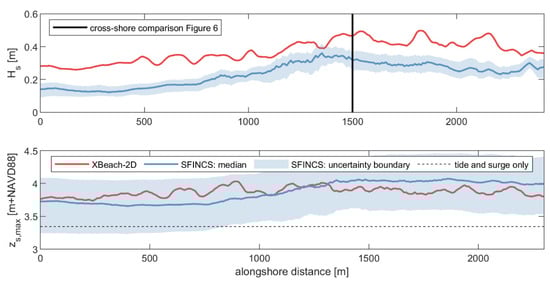 Alongshore-varying wave height (Hs; top panel) and maximum water level (zsmax; bottom panel) as computed by XBeach-2D and SFINCS. The shading represents the 95% confidence interval (−2 and +2 standard deviations) based on the uncertainty of the boundary conditions. For a cross-shore interpretation, see Figure 6.