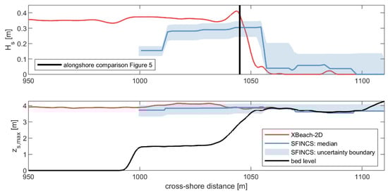 Cross-shore-varying wave height (Hs; top panel) and maximum water level (zsmax; bottom panel) as computed using XBeach-2D and SFINCS. The shading represents the 95% confidence interval (−2 and +2 standard deviations) based on the uncertainty of the boundary conditions. For an alongshore interpretation, see Figure 5.