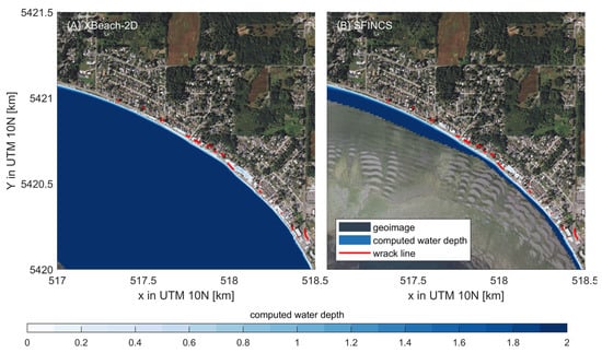 For the Dec 2018 storm, the flood extents for both XB-2D and SFINCS are compared. Visually, the computed water depth using XB-2D and SFINCS match well when compared to the wrack line (Figure 7). Analyzing 407,005 1 × 1 m pixels for these models, shows a hit score of 0.80, indicating that 80% of the area flooded with the computationally expensive XB-2D model is reproduced using the reduced-complexity SFINCS model. The error bias is 0.46, indicating a tendency of underprediction using SFINCS. Only grid cells that are above 2 m NAVD88 and have at least 10 cm of water have been considered in this analysis. The difference in computational expense is a factor of 50,000 lower with SFINCS versus XB-2D (The two-dimensional XBeach-NH+ model (XB-2D) was run as a Linux cluster with 12 cores and took 311 hours to finish. SFINCS was run on a local Windows machine with 16 cores and took 21 seconds to finish. Directly dividing both computational expenses yields a speedup with SFINCS of 53,473 times. In this paper we reported 50,000 to account for the difference in the number of cores). Both simulations ran for 6 hr around the peak of the storm.