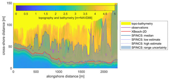 Runup extent as observed (purple), computed with XB-2D (red) and SFINCS (blue). Colors depict the bed level in meter relative to NAVD88. Figure uses a cross-shore- and alongshore-distance coordinate system.