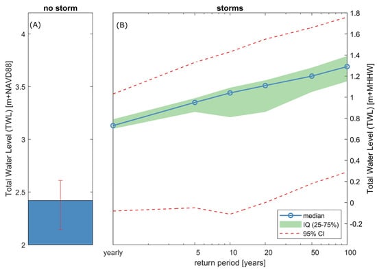 Total water level (TWL) for the no-storm condition (panel (A) and as function of return period for the current sea level (panel (B)). Red error bar in A represents the 95% CI (different values indicate spatial variability of the best-guess across Whatcom County, Washington). MHHW is estimated to be 2.4 m+NAVD88 based on the nearest station.