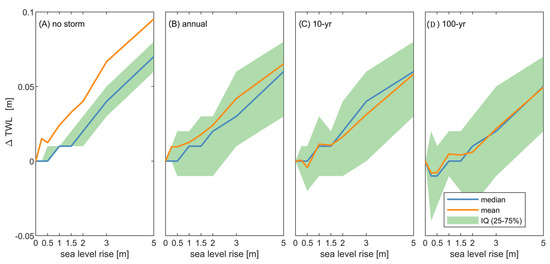 The change in maximum TWL as a function of sea-level rise for storms with return periods ranging from annual events to 100 year recurrence intervals illustrates their non-linearity (Figure 10). Here, the change in total water level (∆TWL) subtracts sea-level rise and, therefore, just shows the non-linearity. The value of ∆TWL increases with the increasing magnitude of SLR and for all SLR and storm return probabilities presented. This suggests that TWL is not a simple linear addition and that non-linearities between SLR, tide, waves, and wave runup are important to evaluate flood hazards across the study area accurately. For example, the TWL during the no-storm conditions increases for an SLR of 3 m between 3 and 5 cm (IQ; median 4 cm). This effect decreases for larger, less frequent storms. For example, the ∆TWL during the 1–100 year storm for SLR of 3 m is estimated to be 0 and 5 cm (IQ; median 3 cm). For most of the grid cells, the change is relatively minor (less than 10 cm), but important, in low-sloping areas. Note also the distance between mean and median which is <1 cm but does indicate a slight skewness in the distribution.