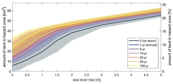 Model results are affected by uncertainties. In particular, in this paper, we distinguish between uncertainty related to the boundary conditions by water level and waves and uncertainty related to the elevations in the model grids. We assume these uncertainties to be uncorrelated unbiased errors and individual sources of uncertainty are summed in quadrature. The standard deviation for each component is estimated to be around 15 cm, which leads to a combined uncertainty of ~25 cm (or −50 and +50 cm for 95% confidence interval; CI). These values are based on 1) metadata from the DEM and 2) model accuracy as reported by [22,23]. We included this range in additional model simulations at the offshore boundary in order to achieve high (+50 cm) and low (−50) estimates besides the ‘best-guess’ results. Uncertainties driven by the model performance and vertical land motion (VLM) were not specifically taken into account, which might result in an underestimation of the error bands.