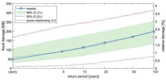 Flood damage as function of return period for 1 m sea-level rise. Colors depict different estimates (median, 68% CI, 95% CI). Left axis shows the damage in USD million (USD M) and right axis as damage relative to total value in percentages.