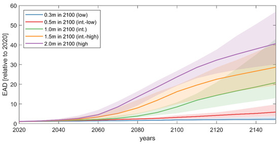 Expected Annual Damage (EAD) as a function of time horizon (x-axis) and projection (colors). Shading represents uncertainty in the sea-level-rise projection (low and high estimates from [3]).