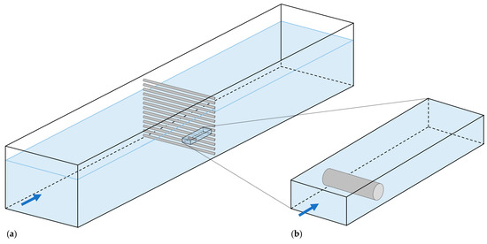 Schematics of (a) a complete model of a horizontally arranged circular bar trash rack (CBTR) in a flume, and (b) a waterbody segment consisting of a single bar section taken from (a): Such segments served as the basis for defining the computational domains in this study. The arrows indicate the direction of flow.