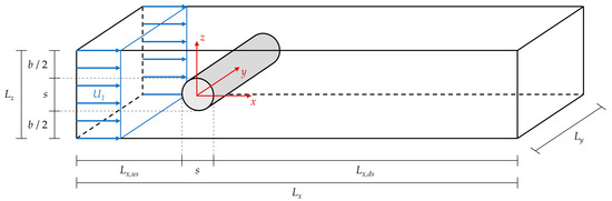 Hexahedral domains in a Cartesian coordinate system were used for the simulations in this study. The x, y, and z axes represented the streamwise, spanwise, and vertical directions, respectively. In the case of a single bar, the bar was placed symmetrically between two parallel walls in the vertical direction, each equidistant from the boundaries by b/2. Figure 2 shows a schematic representation of such a computational domain. In the cases where n = 3 and 5 were used, the equivalent number of single-bar domains were superimposed, with b as the distance between two bars. The dimensions of the domains in the streamwise, spanwise, and vertical directions are denoted as Lx, Ly, and Lz, respectively. Lx can be further divided into upstream and downstream parts separated by the examined rack section (i.e., Lx = Lx,us + s + Lx,ds). Lx,ds, Lx,us, and Ly were initially defined based on the literature data and preliminary simulations. These lengths were then validated in the independence test using the lengths given in Section 3.1.2. In contrast, the value of Lz is a function of the chosen values of n and P, described as Lz = n (s + b).