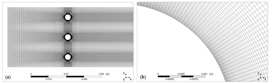 Following the methodology used in several previous studies of flow past a cylinder [64], a hybrid mesh was used as the mesh pattern, consisting of an O-grid in the near-field grid around each bar and an H-grid in the outer regions. An example of the mesh structure in the x–z plane is shown in Figure 3, which shows the front part of a computational domain with n = 3 and the surface of one of the bars in detail. The near-field grid of each bar consisted of a concentric ring shape with an outer diameter of 2s starting from the center of each bar. This size was chosen to ensure homogeneity in the near-field grid construction across all simulations, regardless of Lz. In the near-field grid, the resolution in the x–z plane was defined by the number of elements on the bar circumference and in the radial direction, denoted as Nc and Nr, respectively. To resolve the viscous sublayer of the near-wall region, the dimensionless distance from the wall y+ should be less than one. To achieve this, the height of the first cell adjacent to the bars was set to about 0.00001 m, or about 0.00125s in all simulations. The grid resolution was then increased radially based on Nr. In the outer regions, a maximum grid stretch ratio based on the ratio in the near-field grid was used. By applying periodic and free-slip conditions in the spanwise and vertical directions, respectively, no refined grid resolution was required near the outer boundaries of the domains. In contrast to the x–z plane, the mesh was uniformly structured in the spanwise direction, i.e., the mesh generated in the streamwise and vertical directions was extruded in the spanwise direction with uniform resolution Ly/Ny, where Ny is the number of elements in the spanwise direction. The effects of varying Nc, Nr, and Ny on the results were evaluated in the independence test described in Section 3.1.3. In addition, Nt is reported for all simulations in Section 3.1.