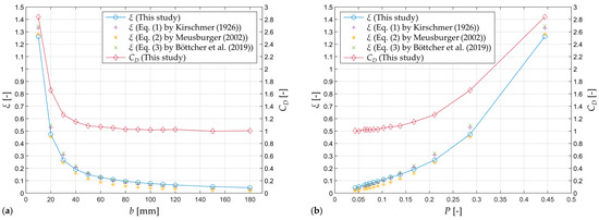 The drag coefficient CD and the head loss coefficient ξ, calculated using Equation (13), as functions of (a) the clear bar spacing b and (b) the blocking ratio P, compared to ξ, calculated using Equations (1), (2), and (3) proposed by Kirschmer [24], Meusburger [2], and Böttcher et al. [29], respectively.