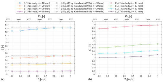 (a) The drag coefficient CD and (b) the head loss coefficient ξ, calculated using Equation (13), as functions of the flow velocity at the inlet U1 and the bar Reynolds number Reb, compared to ξ calculated using Equation (1) proposed by Kirschmer [24].