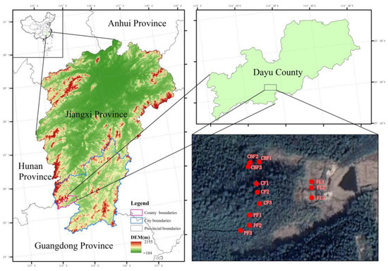 All in situ experiments and sample collections were conducted in Dayu County, Ganzhou City, Jiangxi Province, China (25°15′–25°37′ N; 114°–114°44′ E) (Figure 1). In Figure 1, CBF stands for coniferous and broad-leaved mixed forest; CF stands for coniferous forest; PF stands for bamboo forest (Phyllostachys edulis); and FL stands for fallow land. This area is located in the significant southern hilly mountain zone of China, possessing the world’s largest area of intact subtropical forest ecosystems within the same latitude belt in Central Asia. The climate is subtropical and monsoonal humid, with four distinct seasons. The average annual rainfall is 1563 mm, and the average annual temperature is 18.53 °C, with the lowest temperature occurring in January and the highest temperature in July and August. The annual sunshine time is 1499.3 h. The soil type is classified as Quaternary red clay according to the FAO classification, with 29.3% sand, 39.1% silt, and 31.6% clay.