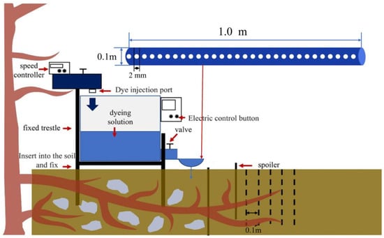 In each plot, we performed one dye-tracer test to visualize the effect of biopores and capture the impact of root systems on flow pathways [36]. We cleared 2.00 m × 2.00 m areas for the dyeing tests in each plot (three replications × four plots). The surface herbaceous plants were trimmed with scissors, and a shovel was used to remove dead material and rocky blocks from the soil‘s surface to reduce disturbance in the soil‘s structure. Within each plot, dyed water was irrigated at a distance of 1.5 m downslope of the tree stem. We chose to apply the dye at this distance to (i) avoid the direct flow of dye close to and around the stem bole, (ii) to avoid being too close to the upper terrace, and (iii) at a distance greater than 1.5 m; therefore, we may not have been able to locate the blue dye downslope of the tree [36]. The dye was contained within a reservoir and introduced by gravity flow into a drain pipe measuring 1.0 m in length and 0.1 m in width. This drain pipe was perforated with 30 holes, each with a diameter of 2 mm. The drain pipe served as the demarcation for the upper boundary of a 1.0 square meter quadrat, which constituted the focal area for subsequent experimental procedures and analyses. The dye permeated through the drain pipe and infiltrated the soil at a consistent discharge rate of 10.0 mL per second. To maintain a relatively stable discharge rate, the water level within the drain pipe was carefully maintained at a uniform level throughout each testing session. To promote infiltration, in each quadrat, a width of stainless steel (1.0 m long by 0.1 m deep) was inserted into the soil 0.3 m away from the upper boundary of the overflow port to block surface runoff. Before the experiments, the soil around the stainless steel was compacted using a rubber mallet.