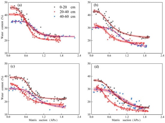 SWCC also varied across different soil horizons and sites. It showed a decreasing trend with the deepening of soil depth, and the volumetric water content of the soil in each suction stage decreased. The matric suction of CBF ranged between 0 and 2.4 kPa, while for the other stands, it ranged between 0 and 1.8 kPa. The saturated water content of 0~20 cm, 20~40 cm, and 40~60 cm soil horizons in CBF was 45%, 40%, and 35%, respectively. The results in CF and PF were similar; the saturated water content of the 0~20 cm soil layer was 43%, and that of the 20~40 cm and 40~60 cm soil horizon was about 30%. In FL, the saturated water content of 0~20 cm, 20~40 cm, and 40~60 cm was 38%, 32%, and 30%, respectively.