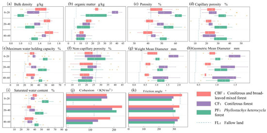 Boxplots of indices under different vegetation types and soil depths. (a): Bulk density; (b): organic matter; (c): porosity; (d): capillary porosity; (e): maximum water holding capacity; (f): non-capillary porosity; (g): weight mean diameter; (h): geometric mean diameter; (i): saturated water content; (j): cohesion; and (k): friction angle. Each of the boxes was based on nine tests, as indicated by the circles, and their outliers are indicated by ‘·’. The blue horizontal dash lines highlight the fallow land along the y-axis.