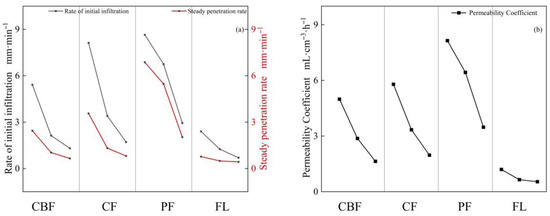 Total porosity, capillary porosity, and non-capillary porosity all decreased with the increasing soil horizon (Figure 4c,d,f), exhibiting significant differences between vegetation types (p < 0.001). The highest total porosity and capillary porosity in the whole soil horizon were found in PF, followed by CF, CBF, and FL. The capillary porosity was higher in CBF, CF, and PF, each accounting for more than 50% of the total porosity, while the non-capillary porosity in FL accounted for about 66%. Capillary porosity is positively correlated with the maximum water retention and saturated water content. The MWHC and SWC decreased with the increasing soil horizon. The variation range of MWHC was 18.29 to 51.11%, and the variation range of saturated water content was 25.34 to 55.65%. The MWHC (Figure 4e) was highest in each horizon for PF, followed by CF, CBF, and FL. Saturated water content (Figure 4i) was the highest in PF, except for the 0~20 cm soil horizon, followed by CBF, CF, and FL. Both the permeability rate and permeability coefficient decreased with the increasing soil horizon (Figure 5). The permeability coefficient and penetration rate of all soil horizons were the highest in PF, followed by CF, CBF, and FL. For example, the permeability coefficients of PF, CF, and CBF were 5.78, 3.83, and 3.16 times higher than that of FL, respectively, in the 0~20 cm soil horizon.