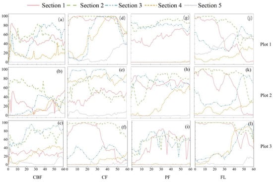 Dyeing area ratio of different vegetation types and different soil horizons. (a–c): Three plots of CBF; (d–f): three plots of CF; (g–i): three plots of PF; and (j–l): three plots of FL.