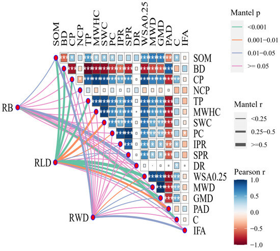 A total of 20 variable elements related to the influence of soil water distribution were selected, and the Pearson correlation analysis was conducted on all the relevant influencing factors. This analysis aimed to observe the relationships between each variable element and the relationship with the soil water distribution, as well as the correlations between each factor and root data (Figure 7). In Figure 7, SOM stands for soil organic matter; BD stands for bulk density; CP stands for capillary porosity; NCP stands for non-capillary porosity; TP stands for total porosity; MWHC stands for the maximum water-holding capacity; SWC stands for the soil water content; PC stands for the permeability coefficient; IPR stands for the initial infiltration rate; SPR stands for the steady infiltration rate; DR stands for the dyeing area ratio; WSA0.25 stands for >0.25 mm water stable aggregate content; MWD stands for the mean weight diameter; GMD stands for the geometric mean diameter; PAD stands for the disruption agglomerate rate; C stands for soil cohesion; IFA stands for the friction angle. RB stands for root biomass; RWD stands for root weight density; and RLD stands for root length density. Soil bulk density is significantly negatively correlated with various variable elements, except for the degree of fragmentation. While it exhibits a positive correlation with soil bulk density and the internal friction angle, most other correlations are negative. The relationship between non-capillary porosity, the internal friction angle, and other variables is weak. Concerning the correlation between the dyed area ratio and other variable elements, it showed a weak correlation with the internal friction angle, and it was negatively correlated with the degree of fragmentation and soil bulk density. Simultaneously, it demonstrated positive correlations with other variable elements to varying degrees. This paper further investigates the relationships among the root and soil mechanical properties, water distribution, and other indicators. The results reveal significant correlations, with root biomass (RB) showing a strong connection with the root diameter (DR) and cohesion (c). Root length density (RLD) exhibits strong correlations with soil organic matter (SOM), bulk density (BD), capillary porosity (CP), total porosity (TP), water-stable aggregates larger than 0.25 mm (WSA0.25), the mean weight diameter (MWD), and geometric mean diameter (GMD). Root weight density (RWD) demonstrates strong correlations with SOM and the internal friction angle (IFA).