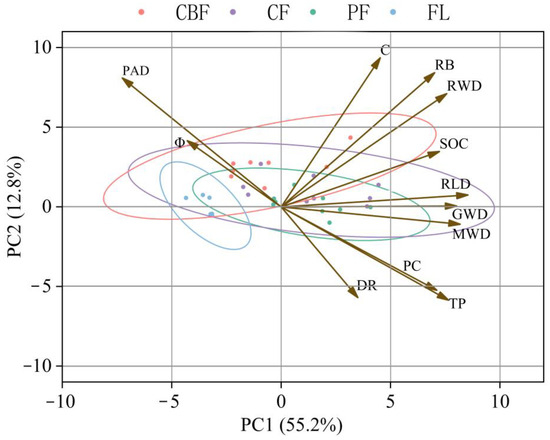 Principal component analysis was performed for each index, with the soil and root traits as explanatory variables (Figure 8). The x- and y-axes represent the unit-less eigenvectors, elucidating the magnitude of variance explained in a certain direction by the principal components, irrespective of their positive or negative values [45,46]. The first two principal components explained 68.0% of the variation in the data. Principal component 1 explained 55.2% of the variation and was primarily associated with RLD, TP, MWD, and RWD. Principal component 2 explained 12.8% of the variation and was mainly associated with PAD. PC1 explained 39.96% of the variation in the dataset, and PC2 explained 17.30% of the variation in all stands. The point distribution of CBF and CF was scattered, while the point distribution of PF and FL was more concentrated. It was evident that different vegetation types exerted varying effects on soil water distribution. A significant positive relationship was found between RLD, MWD, and GMD. The soil dyeing area DR was positively correlated with PC and TP. The soil dyeing area DR was negatively correlated with PAD.